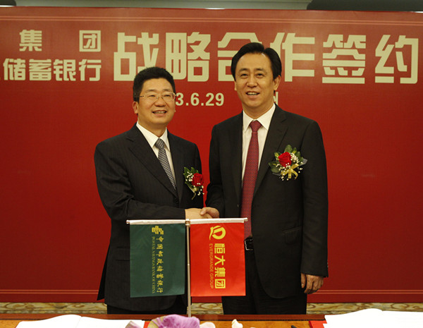 6月29日,恒大集团——中国邮政储蓄银行战略合作签约仪式在恒大集团总部恒大中心举行,双方达成最全面、最深入、最广泛的战略合作,开创银企合作发展新模式。双方合作将涉及授信服务、个人信贷金融服务、现金管理服务、业主优质金融服务、客户经理网络服务、金融创新产品开发等六大领域。